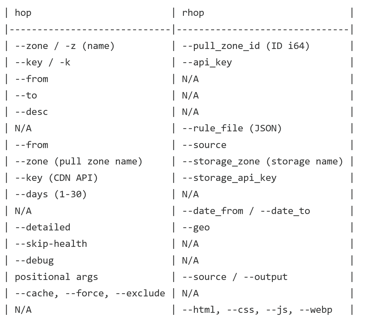 There are big differences in the CLI API of both versions, but differences do not stop there. Both versions have different functionality, the Rust version (Rhop) has a JSON rule file which was not part of the original Hop application.