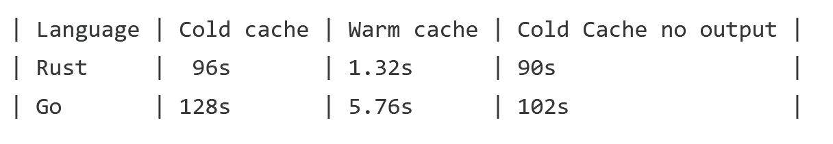 A reduction of running time of 30s is not nothing but it’s not twice as fast with no cache. It is much faster when we’re mostly CPU bound when all images are cached and skipped and only HTML minifying is applied. In this case Rust is ~4x faster - though for my website the Go version is fast enough with 6 seconds. Perhaps the Rust code wasn’t very optimized? Telling Claude Code to optimize the Rust code, it changed the parallelization strategy, applied read optimizations, optimized copies and more, and the time went up to ~100s. Go figure.
