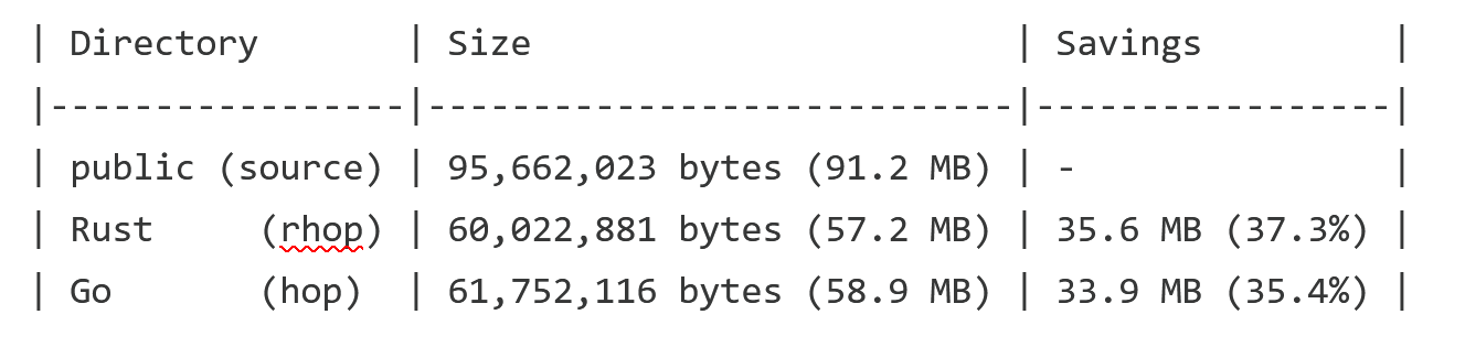 Beside that, the “rules list” command did not work, it listed all Edge rules of the project not only redirects, where the Go version would only print redirect rules (as intended). Minify did not work. The minify command in Rhop did not copy files it could not minify but ignored them. Second, when minify had an error with a JS file or CSS file, because it could not parse it, Rhop did not copy the file but also ignored it. The Go version creates a responsive srcset of WEBP files from one PNG, Rhop only converts one PNG to one WEBP file - forgetting the responsiveness functionality.