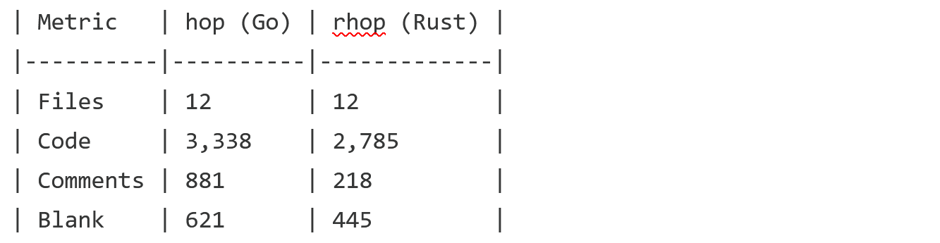 The implementation in Rust has less code than Go, something to be expected because Go is more verbose, but also surprising as LLMs often add more lines of code and are very verbose. On top it looks like Claude Code is not very noisy by adding lots of comments, as LLMs have also been accused of.